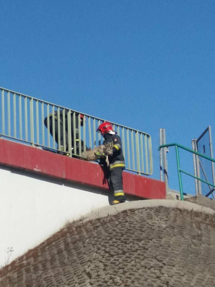 Strażacy Jednostki Ratunkowo Gaśniczej ze Skoczowa oswobodzli zwierzę, zaklinowane w barierkach ruchliwej drogi.
