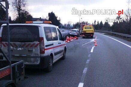 Policjanci z Cieszyna ustalają przyczyny i okoliczności wypadku, do jakiego doszło dziś w południe na DK81 w Drogomyślu. Na jezdni prowadzącej w kierunku Skoczowa audi zderzyło się z pojazdem służby drogowej, malującym pasy na jezdni. Do szpitala został przewieziony operator maszyny.