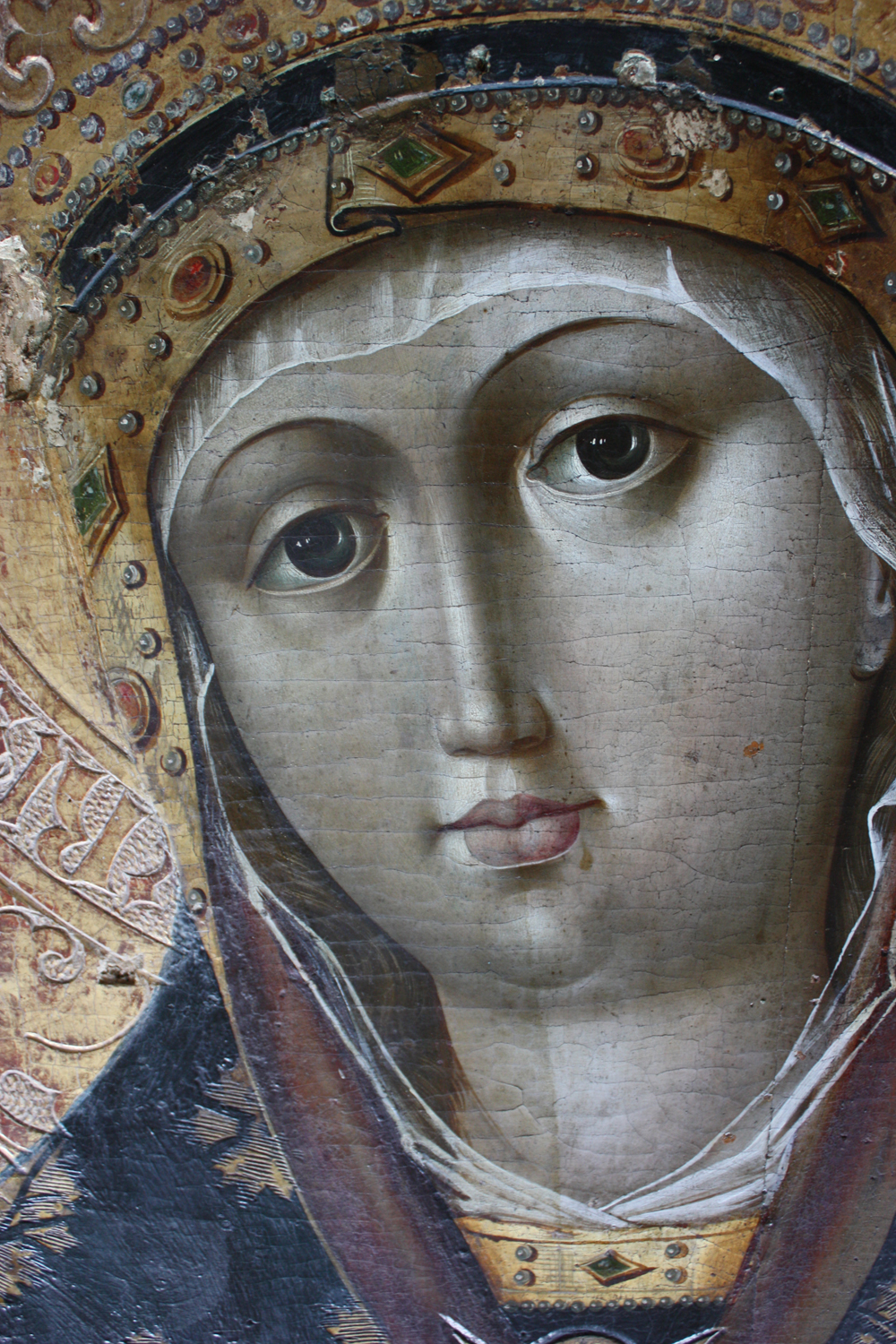 - Spod późniejszych złoceń odsłonięto bardzo misternie wykonaną koronę Madonny, gdzie na jej obręczy ukazały się przepięknie malowane kamienie szlachetne i perły oraz misternie zaplecione sterczyny, wykonane ze stylizowanych liści akantu” – zauważył Tracz, wskazując zarazem na lepiej już widoczny łaciński napis umieszczony na nimbie Madonny, będący początkiem wielkanocnej antyfony „Regina Coeli laetare alleluia” (Królowo niebios wesel się, alleluja).