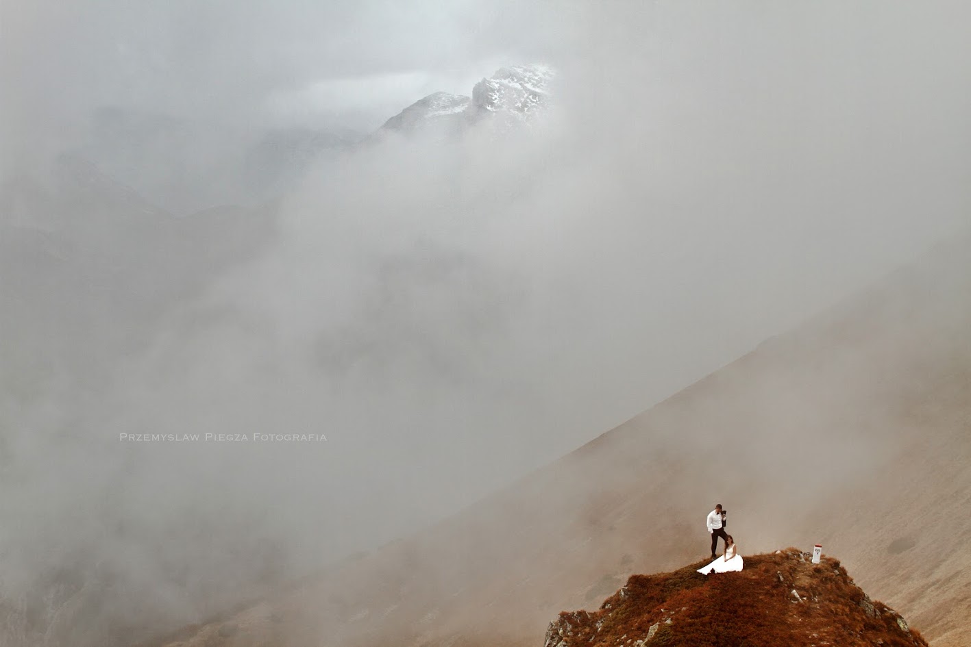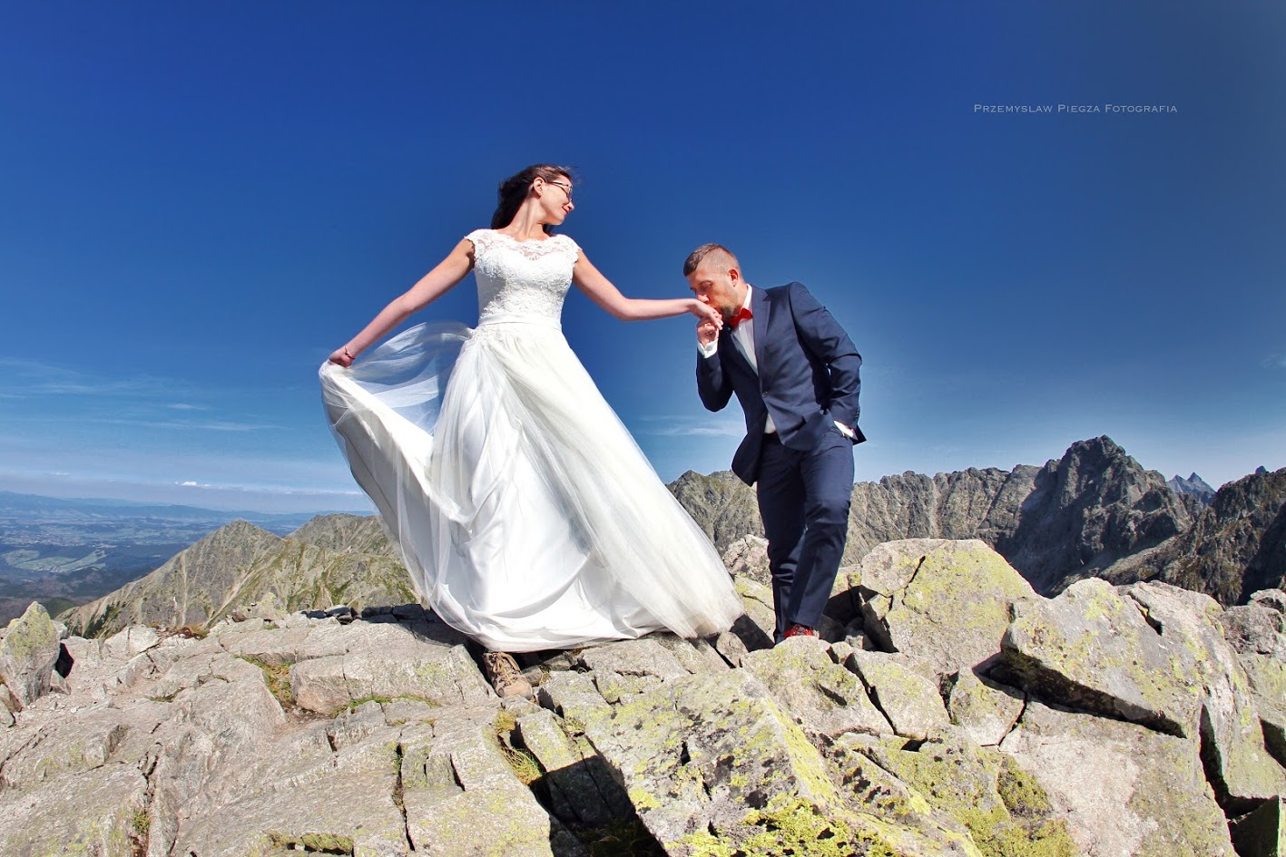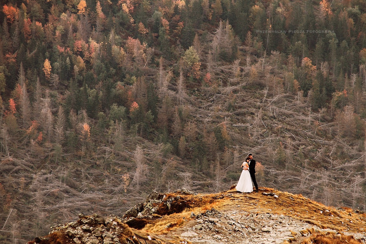 - Nikt mi nie powiedział, że tak będzie - trzęsącymi sie rękami panna młoda raz podtrzymuje suknię, raz wspiera się o skałę, zwisającą wzdłuż wąskiego i stromego szlaku w okolicy Kasprowego. To jest [WYEDYTOWANO, SŁOWO WULGARNE] zagrożenie życia - komentuje, a ja podaję jej rękę, by mogła bezpiecznie zsunąć się po granitowym głazie. Na szczęście ma adidasy, ale jej małżonek o tym nie pomyślał. Na stopach lakierki, oczywiście podeszwa gładka, jak skóra niemowlęcia. Jemu też pomagam. - Dzięki, tośmy sobie wymyslili romantyczną sesję. A ta fotografka mądra, bo ma trapery i gna przed siebie - przeklina pod nosem. A ja śmieję się w duchu. Jest październik, prawie 1900 m n.p.m., silny wiatr i zimno. Mam odpowiednie obuwie, ciepły softshell, szlak jest śliski. Panna młoda zamiata go suknią, welon wiruje. Nie widać na twarzach nowożeńców bezgranicznego szczęścia, raczej złość na samych siebie, malującą się na zmarzniętych czołach. Ale są też, a w zasadzie głównie, tacy, którzy plener wybierają świadomie, znają góry.